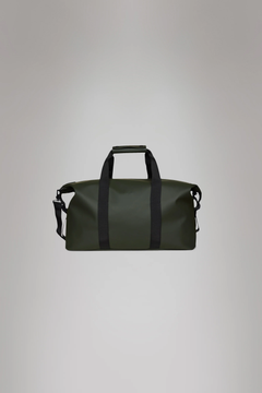 Borsone Hilo Weekend Bag, realizzato nel caratteristico tessuto impermeabile Rains, chiusura con cerniera rivestita, scomparto principale, cinghie di compressione laterali, spallaccio rinforzato regolabile e rimovibile, manici a cinghia con impugnatura, colore verde