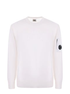 Maglione girocollo realizzata in lana merino extrafine. Il filato morbido e leggero offre una texture raffinata e un comfort superiore. Il modello presenta l'iconica Lente di C.P. Company, polsini e orlo a costine. Rifinito con cuciture a contrasto. Finezza 12. Regular fit. Colore blu