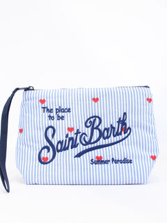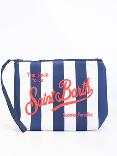 Pochette Aline stripes, modello fantasia a righe bicolor, logo al centro, polsiera fissa, chiusura zip, colore marrone