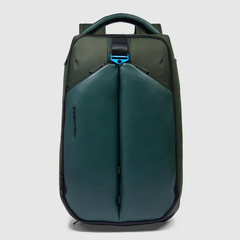 Zaino da viaggio Piquadro, misure compatibili con le normative EasyJet, scompartimento interno porta notebook da 15.6" e ipad, realizzato in tessuto riciclato e pelle vegana, scompartimenti multi tasking, protezione antiurto e sistema RFID