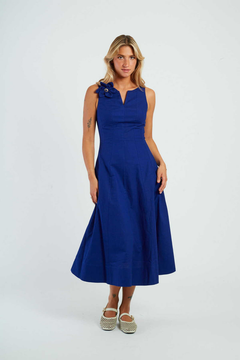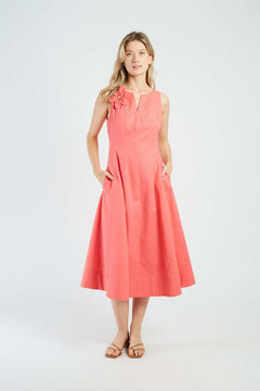 Abito basic media lunghezza con spalline, realizzato in lino, gonna svasata, tasche laterali invisibili e spilla fiore rimovibile, colore bianco